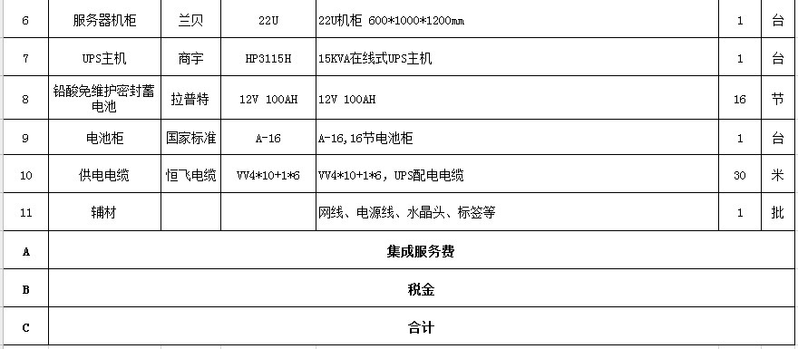 4、为保障服务器设备在断电时不丢失业务数据,需更换一套UPS设备,尽量延长服务器的待机时间。(详细清单附后)