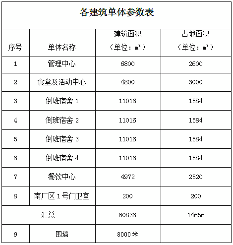 采购项目内容包括:管理中心、食堂及活动中心、倒班宿舍(暂定四栋)、餐饮中心、南厂区门卫室、围墙立面概念设计,各单体参数如下表: