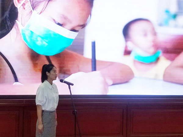 “这是一群无形而又特别的抗疫者,没有请战书,没有红手印,没有被表彰,甚至连几张抗疫的照片都没有。但是他们的袋子里总怀揣着厚厚的清单,今天是658张”“ 新的路上,是团结一心、英勇无畏的抗疫精神,也是发展为上、民生为本的弘湘力量!”比赛现场,黄雅婷紧紧围绕弘湘战“疫”这一主题,讲述了一个个发生在弘湘抗疫的感人故事。作为比赛第一位出场的她以真挚的情感、极富感染力的宣讲方式以及自然朴实流畅的语言,将“第658份清单”的弘湘战疫的故事声情并茂地呈现在各位评委和观众面前,用真人、真事、真情表达弘湘人在抗疫战斗中的不畏困难、勇于担当,展现了弘湘集团全体党员干部在疫情防控中团结一心,勇往直前的精神风貌。
