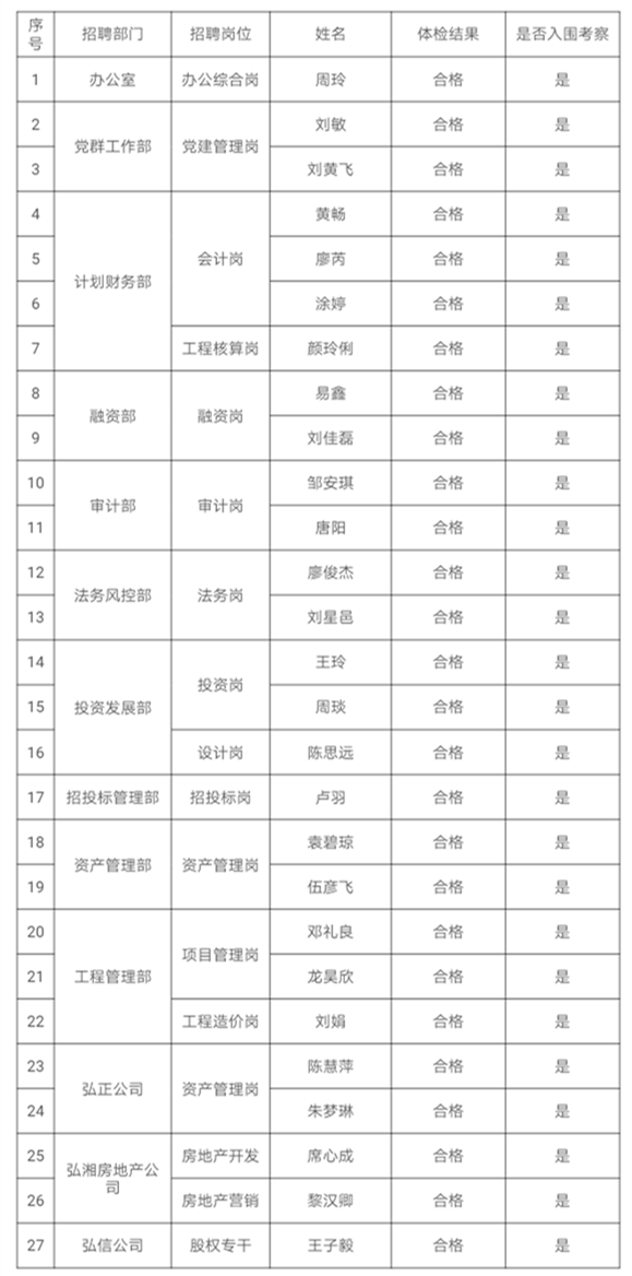 附件:衡阳弘湘国有投资(控股)集团有限公司2020年公开招聘员工体检结果及入围考察人员公示