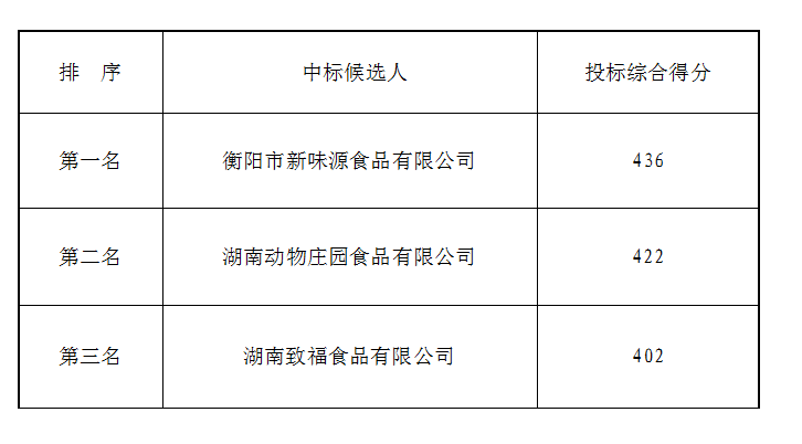 衡阳弘湘食堂食材(肉类)于2021年7月28日下午3时00分(北京时间)进行了比选开标、评标活动,评标小组按照招标公告规定的评标办法及原则进行评定,确定中标候选人如下: