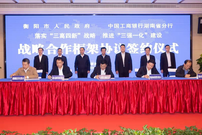 11月3日上午,衡阳市政府与工商银行湖南省分行举行“落实‘三高四新’战略、推进‘三强一化’建设战略合作框架协议”签约仪式。市委书记秦国文出席签约仪式并见证签约。市委副书记、市长朱健,工商银行湖南省分行党委书记、行长张慎先后致辞并见证签约。弘湘国投作为政府平台公司代表参加仪式,签订银企合作协议。