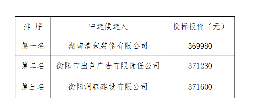 衡拖棚改(一期)扫尾零星工程施工单位比选于2022年7月1日上午9时00分(北京时间)进行了比选开标、评标活动,评标委员会按照比选文件规定的评标办法及原则进行评定,推荐中选候选人排名如下: