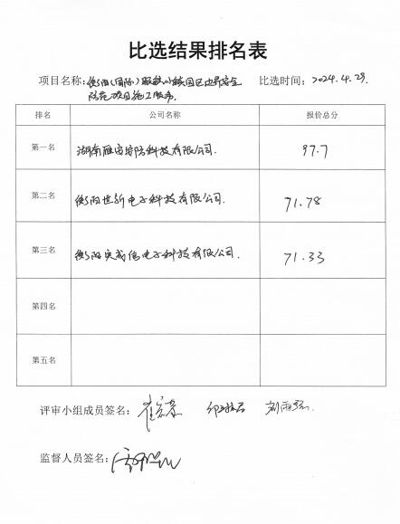 2024年4月29日上午10:00点,我司在衡阳(国际)眼镜小镇首开区标准厂房二楼服务中心会议室举行了衡阳视界科技发展有限公司衡阳(国际)眼镜小镇园区边界安全防范项目比选。经现场报价及评审小组综合评审,现将中选候选人排名结果公示如下: