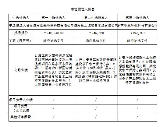 植物园七条道路水土保持方案编制项目水土保持咨询服务比选于2025年07月08日15时00分在衡阳国投4栋3楼评标室进行了比选开标、评标活动,评标委员会按照比选文件及相关法律法规规定进行评审,推荐以下三名中选候选人(排序),现将相关信息予以公示。