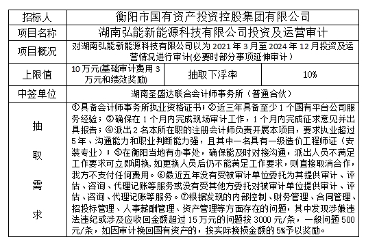 湖南弘能新能源科技有限公司投资及运营审计于2025年6月24日在衡阳国投4栋3楼评标室进行了随机抽取,现将相关信息予以公示。