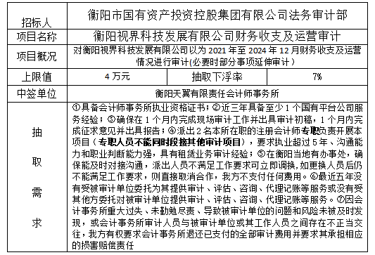 衡阳视界科技发展有限公司财务收支及运营审计于2025年10月17日在衡阳国投4栋3楼评标室进行了随机抽取,现将相关信息予以公示。