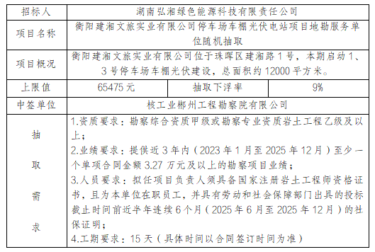 衡阳建湘文旅实业有限公司停车场车棚光伏电站项目勘察服务随机抽取结果公示